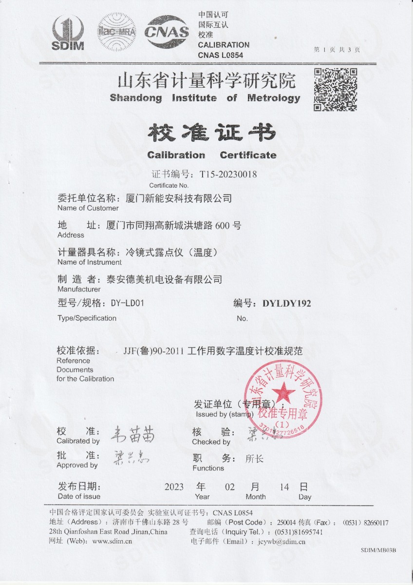 | 上一條:廈門新能安科技有限公司 冷鏡式露點(diǎn)儀 檢定證書 | 下一條:便攜式干體爐(-30-150℃)校準(zhǔn)證書 |