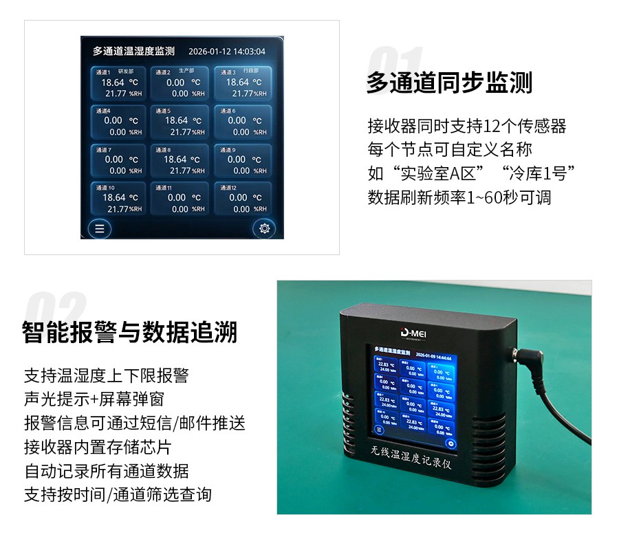 無線溫濕度采集系統(tǒng)是一款高精度、多通道、易部署的環(huán)境監(jiān)測解決方案,由無線溫濕度傳感器和無線接收器兩部分組成。系統(tǒng)采用瑞士Sensirion原裝溫濕度探頭,結(jié)合2.4G無線通信技術(shù)與工業(yè)級顯示模塊,支持多只傳感器同步監(jiān)測,適用于實(shí)驗(yàn)室、倉儲、農(nóng)業(yè)大棚、機(jī)房等多場景的溫濕度實(shí)時(shí)監(jiān)控與數(shù)據(jù)追溯。