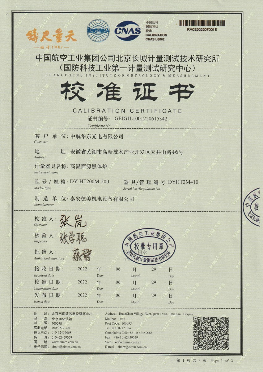 | 上一條:中國航空工業(yè)集團(tuán)公司沈陽空氣動力研究所-黑體輻射源 | 下一條:冷鏡式露點(diǎn)儀校準(zhǔn)證書 |